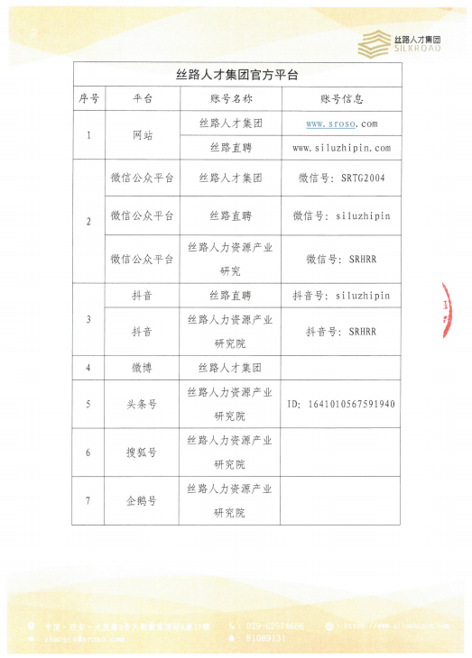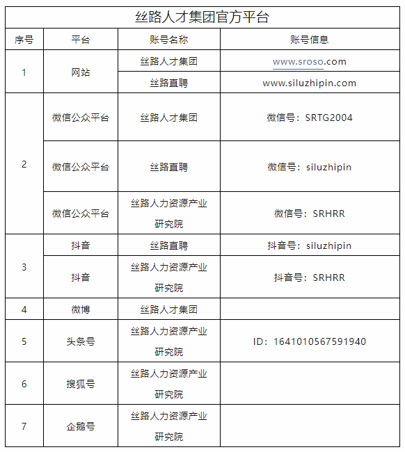 网站(https://www.sroso.com)(https://www.siluzhipin.com)微信公众号(丝路人才集团、丝路人力资源产业研究院、丝路直聘)、抖音号(丝路人力资源产业研究院、丝路直聘)、视频号(丝路人力资源产业研究院、丝路直聘)、微博(@丝路人才集团、丝路人力资源产业研究院、丝路直聘)、企鹅号(丝路人力资源产业研究院)、搜狐号(丝路人力资源产业研究院)、今日头条(丝路人力资源产业研究院)等,所有通知、公告及其他信息均通过以上渠道发布,请大家注意识别。