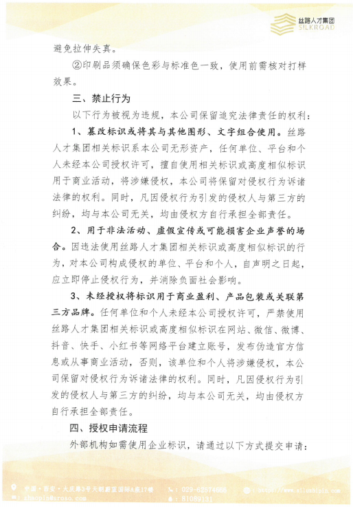 1、篡改标识或将其与其他图形、文字组合使用。丝路人才集团相关标识系本公司无形资产,任何单位、平台和个人未经本公司授权许可,擅自使用相关标识或高度相似标识用于商业活动,将涉嫌侵权,本公司将保留对侵权行为诉诸法律的权利。同时,凡因侵权行为引发的侵权人与第三方的纠纷,均与本公司无关,均由侵权方自行承担全部责任。