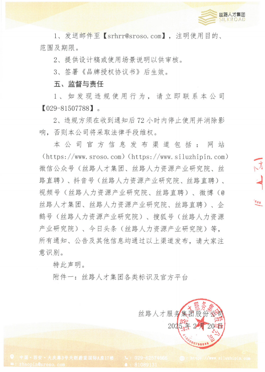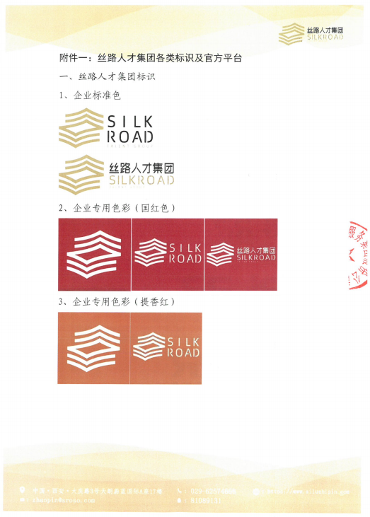 丝路人才服务集团股份公司(以下简称丝路人才集团)的企业标识(包括但不限于LOGO、商标、徽标、品牌名称、图形、标准色、字体组合等,详见附件一)是本公司品牌形象的核心组成部分,代表着企业的价值观和信誉。为规范企业标识的使用,维护品牌统一性及法律权益,特制定本声明: