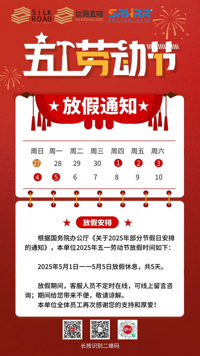 根据国务院办公厅《关于2025年部分节假日安排的通知》,本单位2025年五一劳动节放假时间安排如下: 2025年5月1日--5月5日放假休息,共5天。 放假期间,客服人员不定时在线,可线上留言咨询,期间给您带来不便,敬请谅解。 本单位全体员工再次感谢您的支持和厚爱!