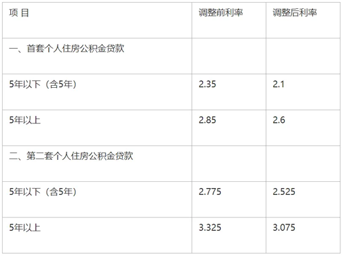 降低个人住房公积金贷款利率0.25个百分点,五年期以上首套房利率由2.85%降至2.6%,其他期限的利率同步调整。