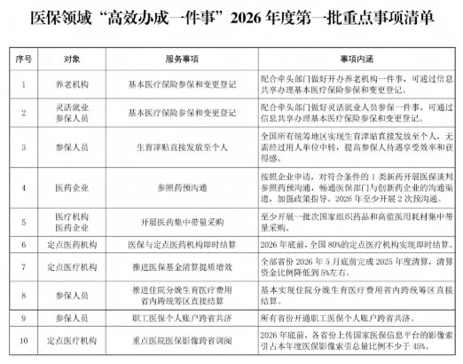 此外,清单明确,2026年底前,全国80%的定点医疗机构实现即时结算;至少开展一批次国家组织药品和高值医用耗材集中带量采购;基本实现住院分娩生育医疗费用省内跨统筹区直接结算。